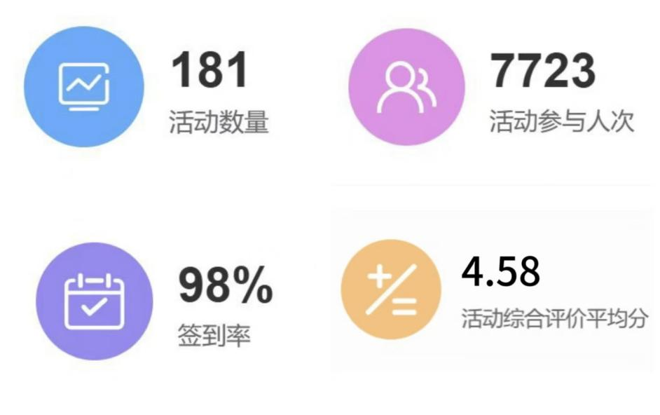 谈球吧体育官网入口第二课堂本周活动量为181,活动参与人数为7723,活动的签到率达到98%,几乎全员参与,活动综合评价的平均分为4.58。