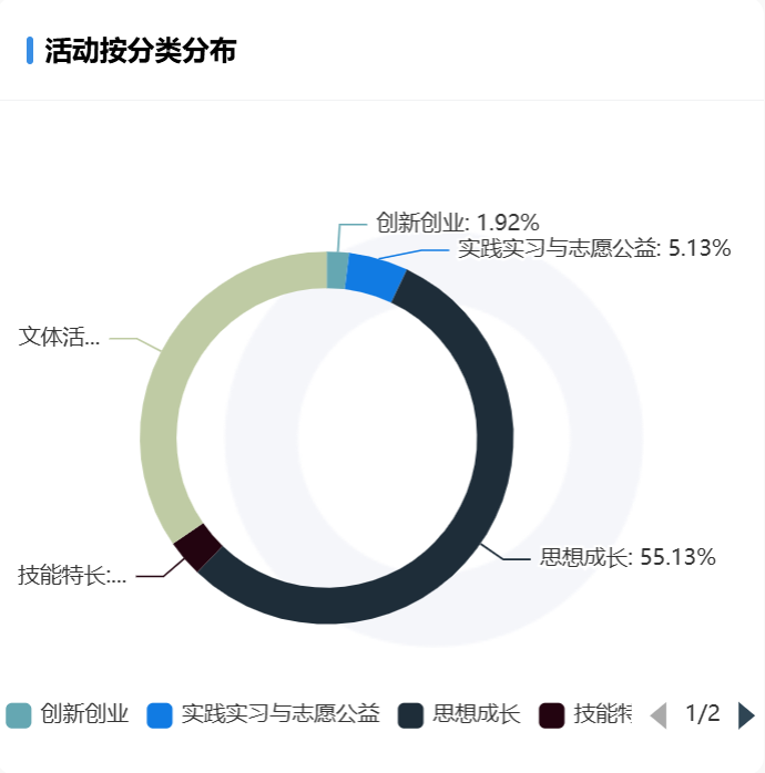 活动主要以思想成长类为首,其频率高达55.13%,其次是文体活动,实践实习与志愿公益也紧跟其后。