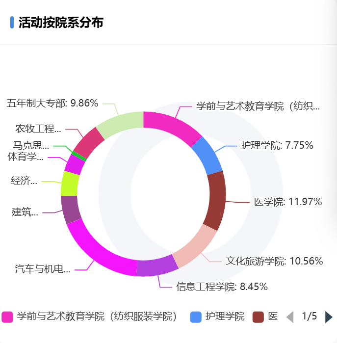 各院系发布的活动数量占比,前三名分别是汽车与机电工程学院、学前与艺术教育学院(纺织服装学院)、医学院。