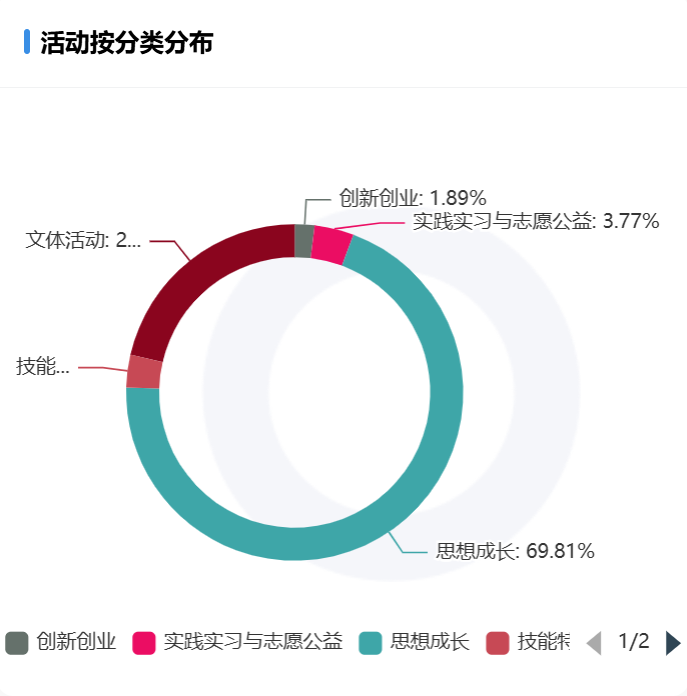 活动主要以思想成长类为首,其频率高达69.81%,其次是文体活动,实践实习与志愿公益也紧跟其后。
