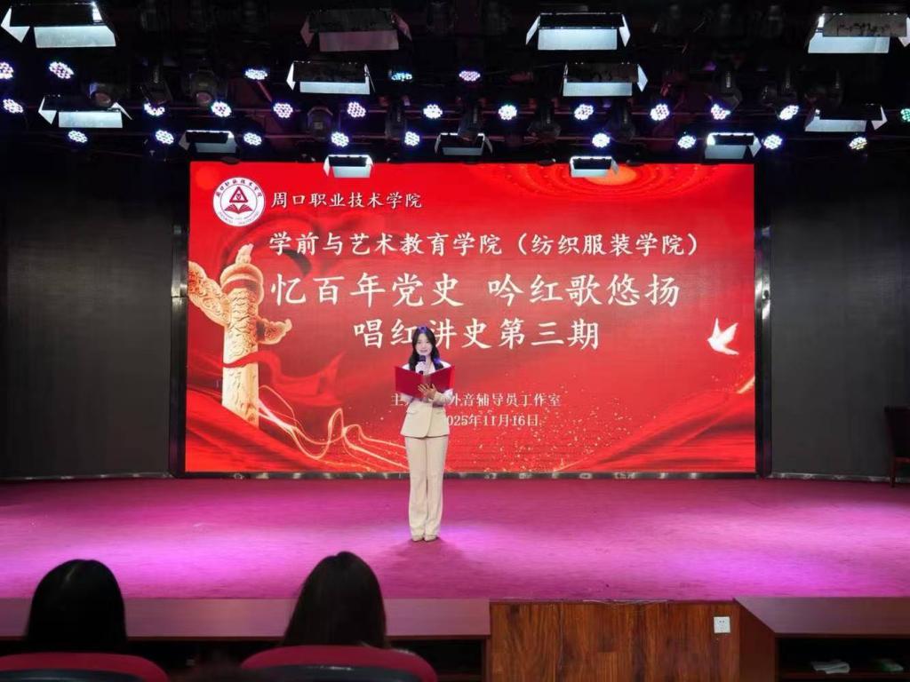 百年党史,是风雨兼程的奋斗史诗;一曲红歌,是直抵人心的信仰之声。在学前与艺术教育学院(纺织服装学院)“唱红讲史”第三期的舞台上,我们以红歌为帆,溯党史长河,在悠扬旋律中回望峥嵘岁月,在鲜活故事里感悟初心使命。从红船启航到盛世华章,红色旋律穿越时空,革命精神薪火相传。愿每一位青年学子都能在红歌里汲取力量,在党史中锚定方向,以青春之音传唱红色经典,以赤子之心续写时代荣光!