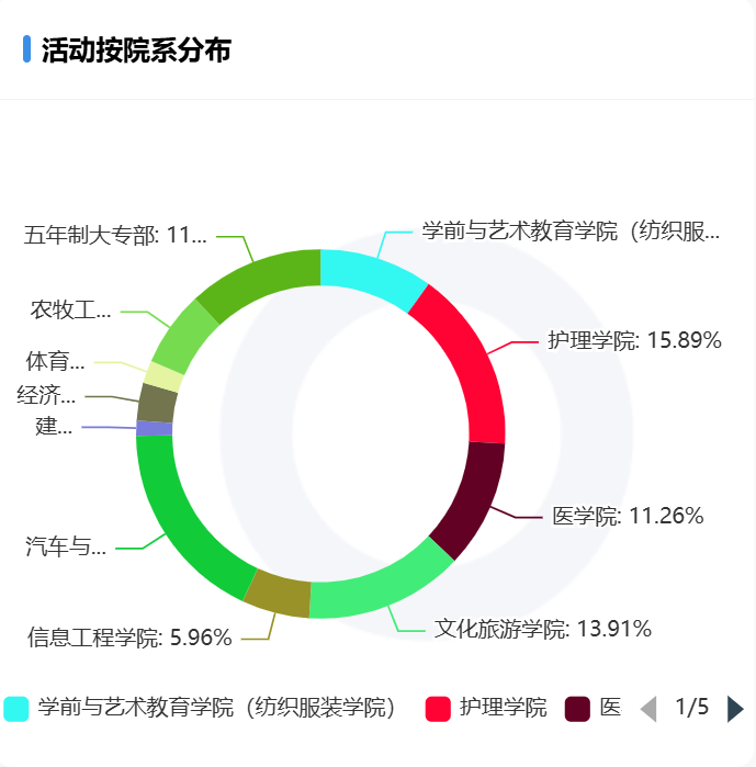 各院系发布的活动数量占比,前三名分别是汽车与机电工程学院、护理学院、文化旅游学院。
