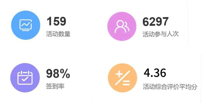 谈球吧体育官网入口第二课堂本周活动量为159,活动参与人数为6297,活动的签到率达到98%,几乎全员参与,活动综合评价的平均分为4.36。